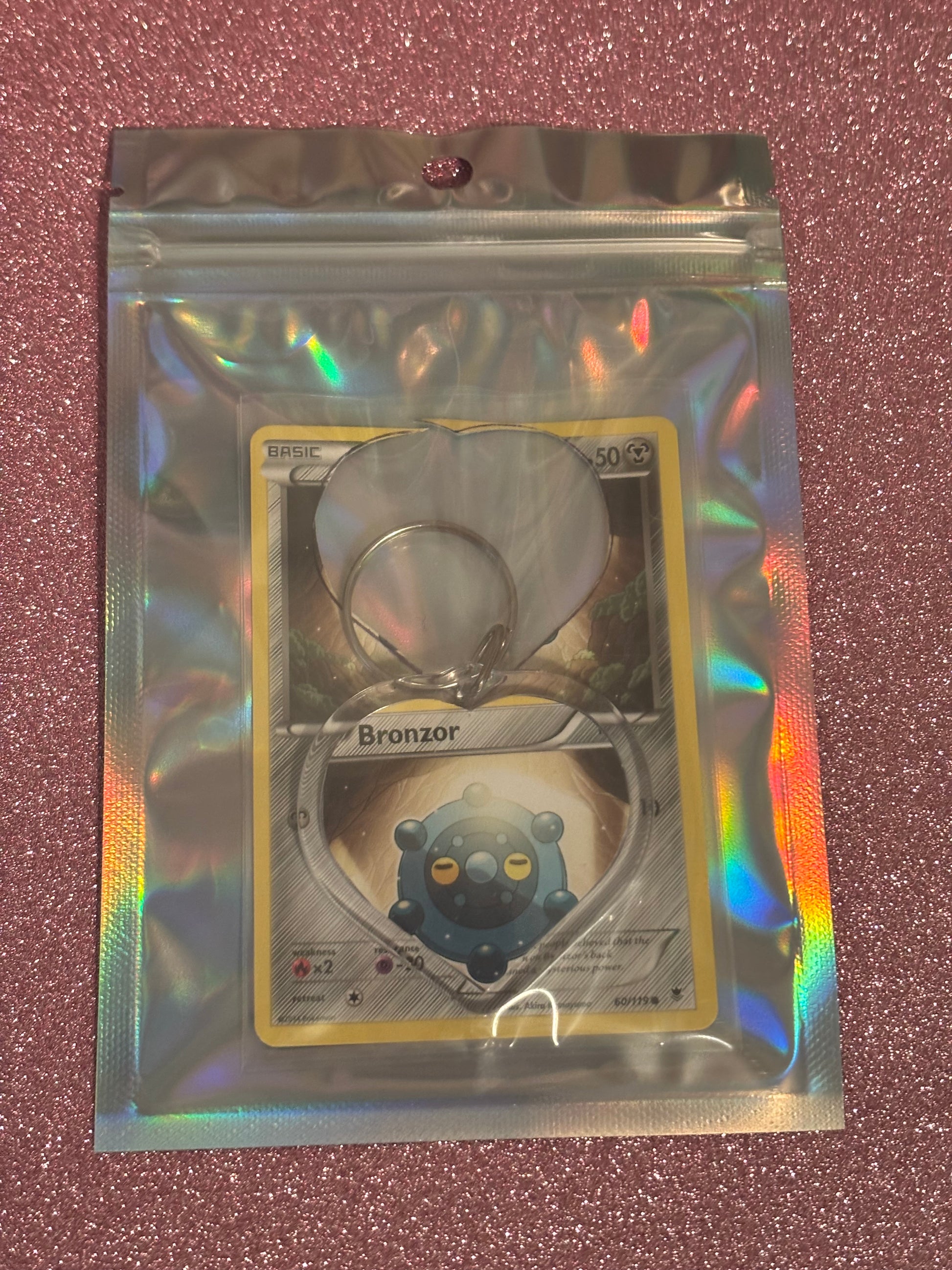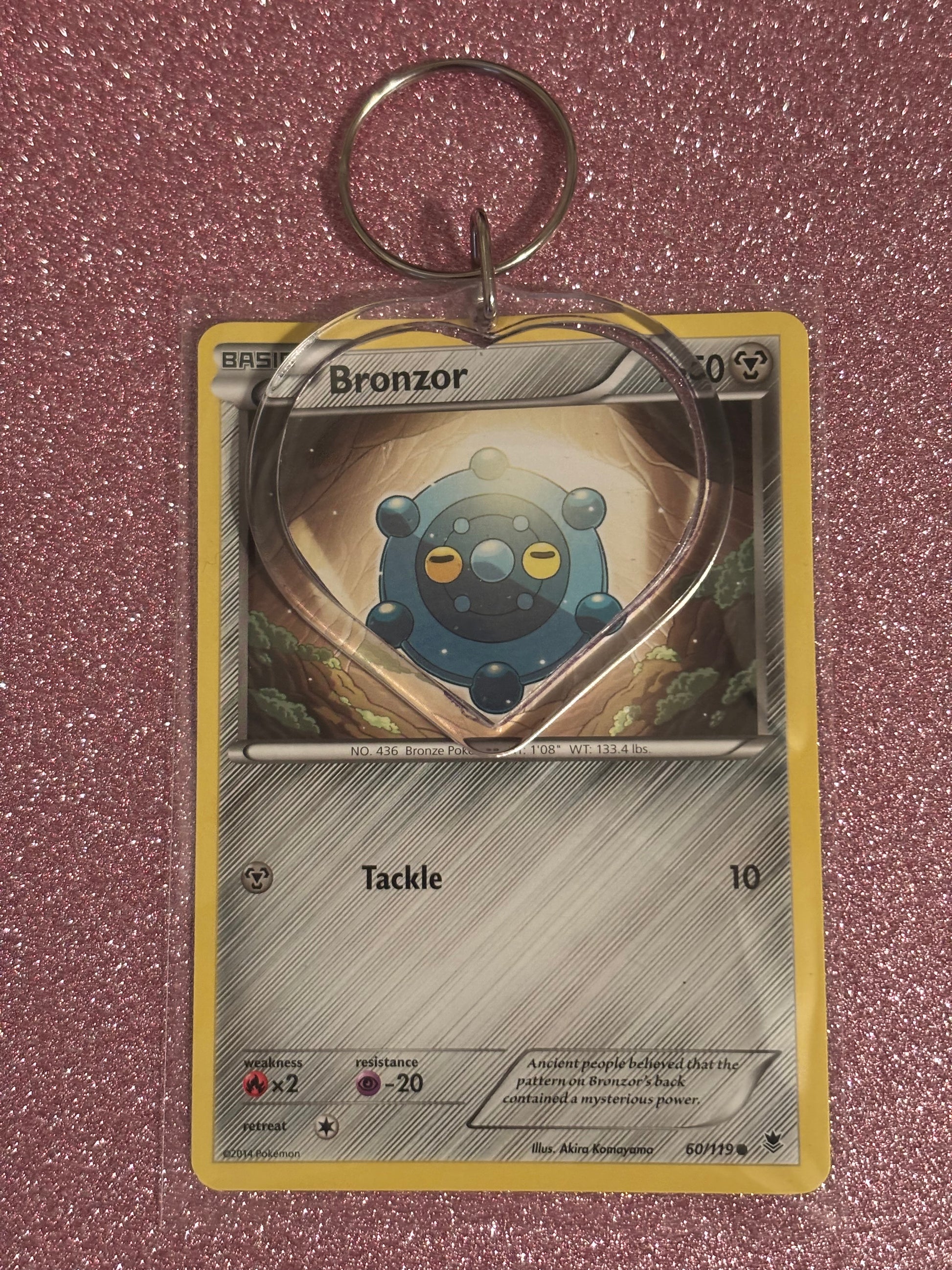 KEYCHAIN MADE FROM Upcycled POKÉMON CARD Bronzor 60/119 2014 Illus. Akira Komayama